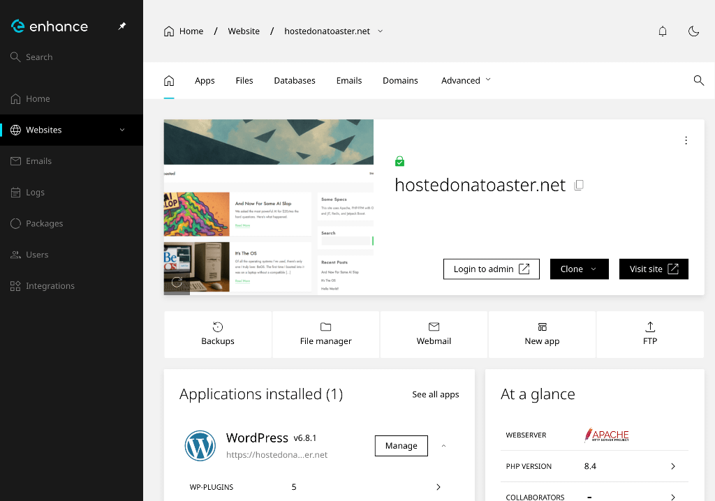 Enhance is a modern hosting control panel with nice features like clustering and containerization. This enables some cool perks like dedicated Redis instances for each site. Enhance also supports importing account backups from cPanel and Plesk.